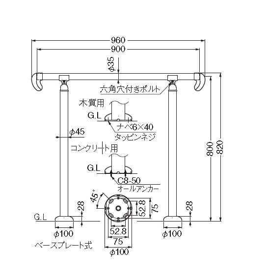 受け支柱 ベースプレートタイプ NO.3057(1本)エラストパイプ 階段 平地取付可能 埋め込み取付