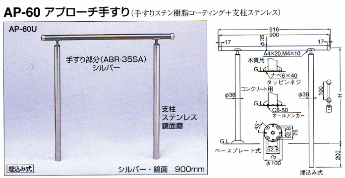シロクマ 白熊印・ステンレス製高耐久性アプローチ手すり AP-60B ベースプレート式 (手摺 てすり 坂 斜面 バリアフリー 介護 リフォーム 屋外 階段)